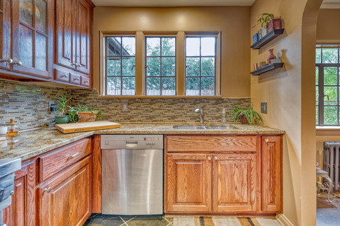 dining room shares many of these same details. German painters were commissioned during construction to paint the crown molding and ceiling medallions and you can still see their work to this day as it's been preserved. All of the original wrought iron windows have been well cared for and maintained. The second story vintage tiffany style chandelier brings timeless character to the home. The bathrooms feature their original mosaic tile (with extra original replacements stored in the basement). This home has been meticulously maintained throughout the years to preserve its original charm and character with some upgrading like that of the kitchen and the partially finished basement.